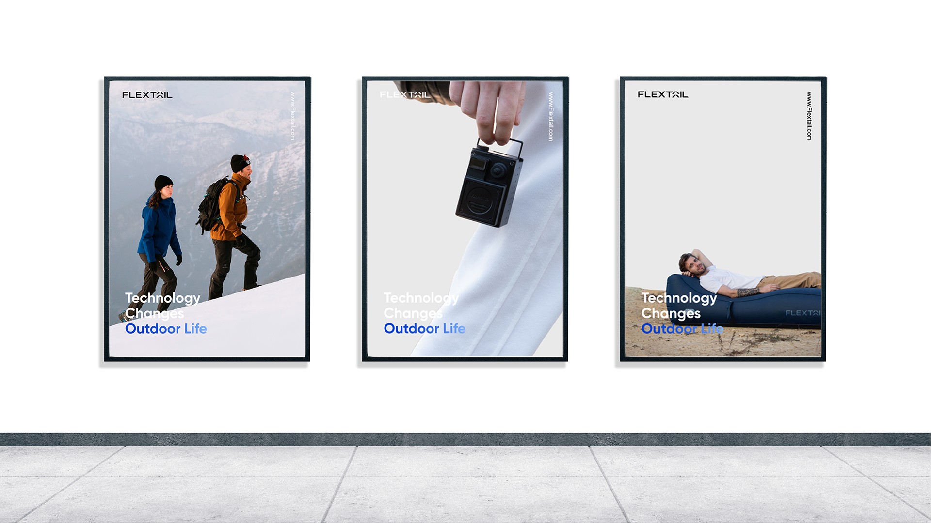 首先,我們以字標結(jié)合記憶點的形式進行l(wèi)ogo設計,選擇FLEXTAIL名字中的“A”作為記憶點進行塑造,通過解構(gòu)的方式,將A分成上面兩個部分結(jié)合箭頭的形式,創(chuàng)造出不斷向上的視覺感受,代表了魚尾品牌不斷創(chuàng)新迭代突破產(chǎn)品極限的研發(fā)精神,整體字標棱角分明、利落整潔,彰顯科技感,更吻合戶外電器產(chǎn)品的想象。其次,在品牌的系統(tǒng)中我們以“輕量化”作為原則,在色彩方面,使用科技藍與高級灰色為搭配,突出品牌的科技質(zhì)感,讓色彩更干凈整潔。在圖形方面中,我們從品牌logo出發(fā),提取線條作為圖形的應用,整體圖形遵循輕量化的原則,不過多的進行大面積運用,而是通過與產(chǎn)品或影像內(nèi)容的結(jié)構(gòu)做配合,優(yōu)先突出品牌產(chǎn)品展示,讓視覺語言輕量結(jié)合。